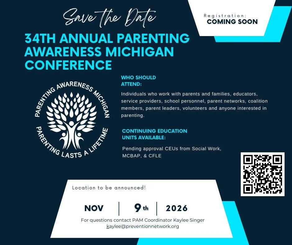 34th Annual Parenting Awareness Michigan Conference Monday, November 9, 2026 9:00 AM 5:00 PM 09:00 17:00 Google Calendar ICS