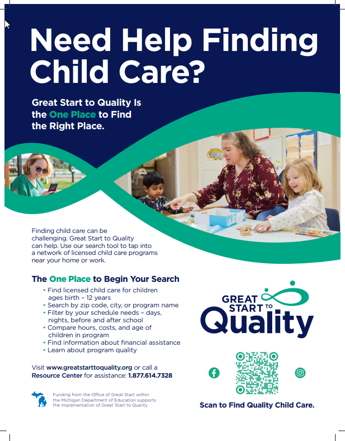 We would like to thank the Michigan Council for Arts and Cultural Affairs for the recent $1200.00 grant to the Clare-Gladwin Great Start Collaborative. This grant will allow us to provide over 500 families and children in Gladwin and Clare Counties an opportunity to experience an exciting performance by a Michigan artist!